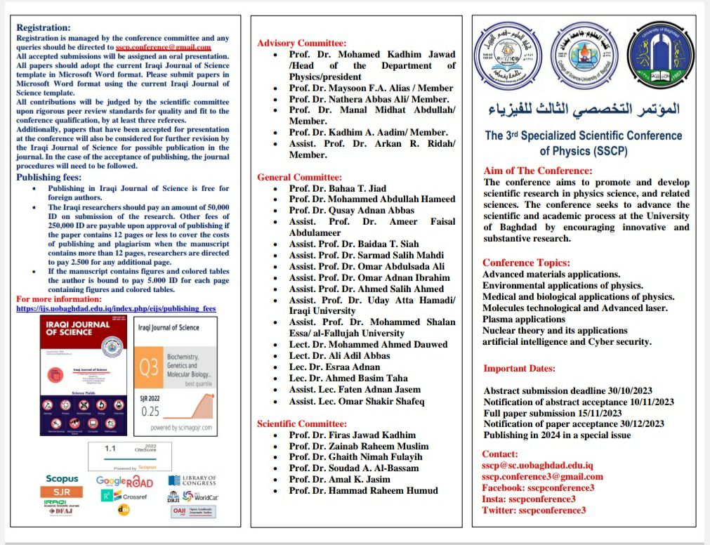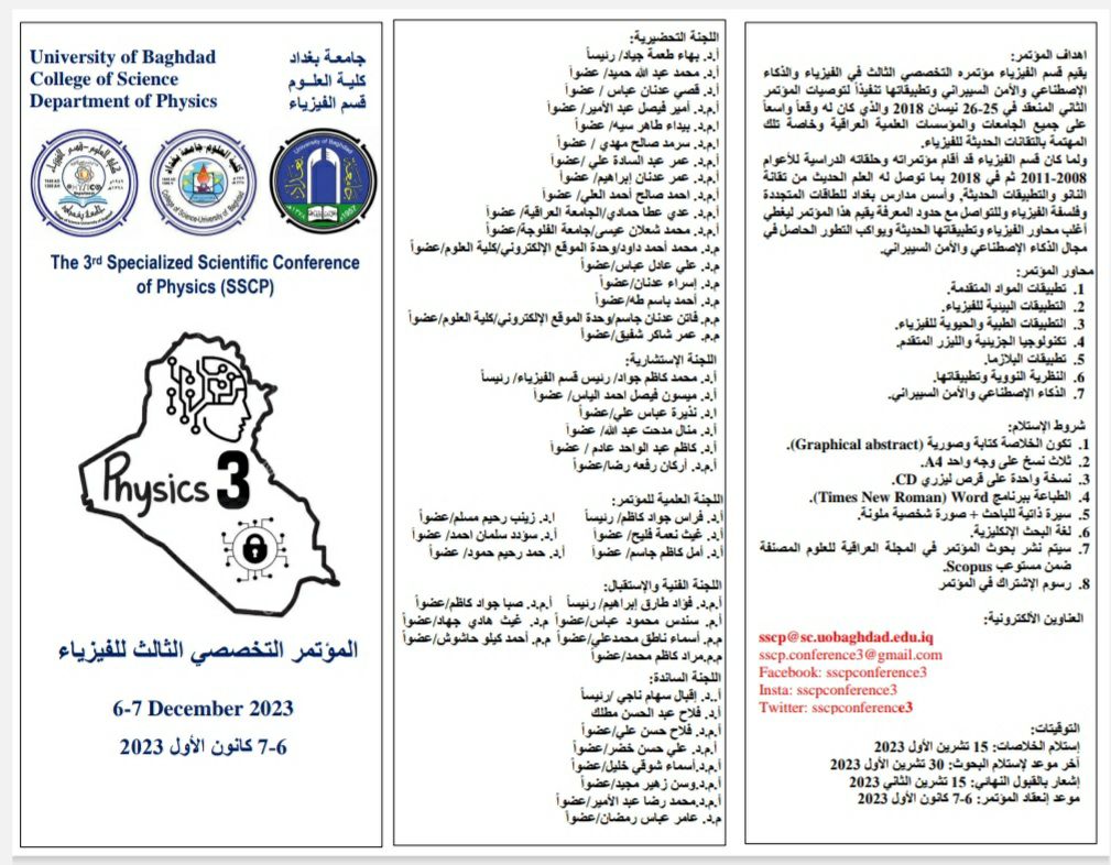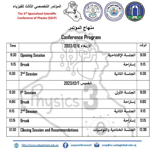 The Conference is a two-day event on December 6-7, 2023 at the University of Baghdad. It will showcase the latest research and innovations in nuclear physics, plasma physics, laser physics, nanotechnology, and renewable energy. It will also honor two eminent physicists and feature four keynote speeches, 24 oral presentations, 20 posters, and four workshops. The conference is open to all interested participants who can register and submit their abstracts online. For more information about the conference program please click her.